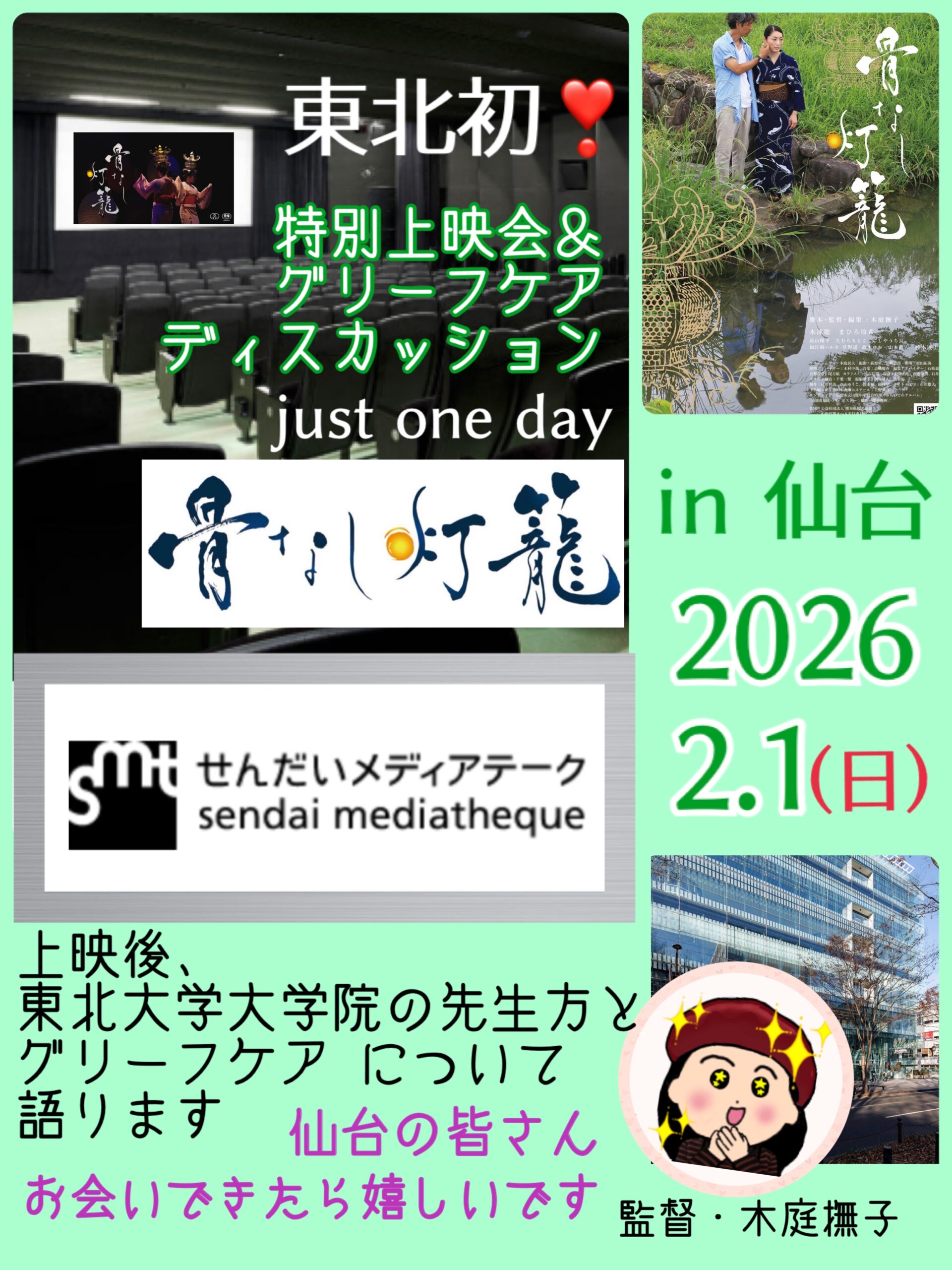 司会をメディアコンサルタントの境治さんにお願いして、東京に引き続き東洋英和女学院の奥山倫明先生と、今回は東北大学の先生たちをお招きして、映画『骨なし灯籠』とグリーフケア (大切な人を亡くした哀しみに寄り添う、心のケア)についてお話します。