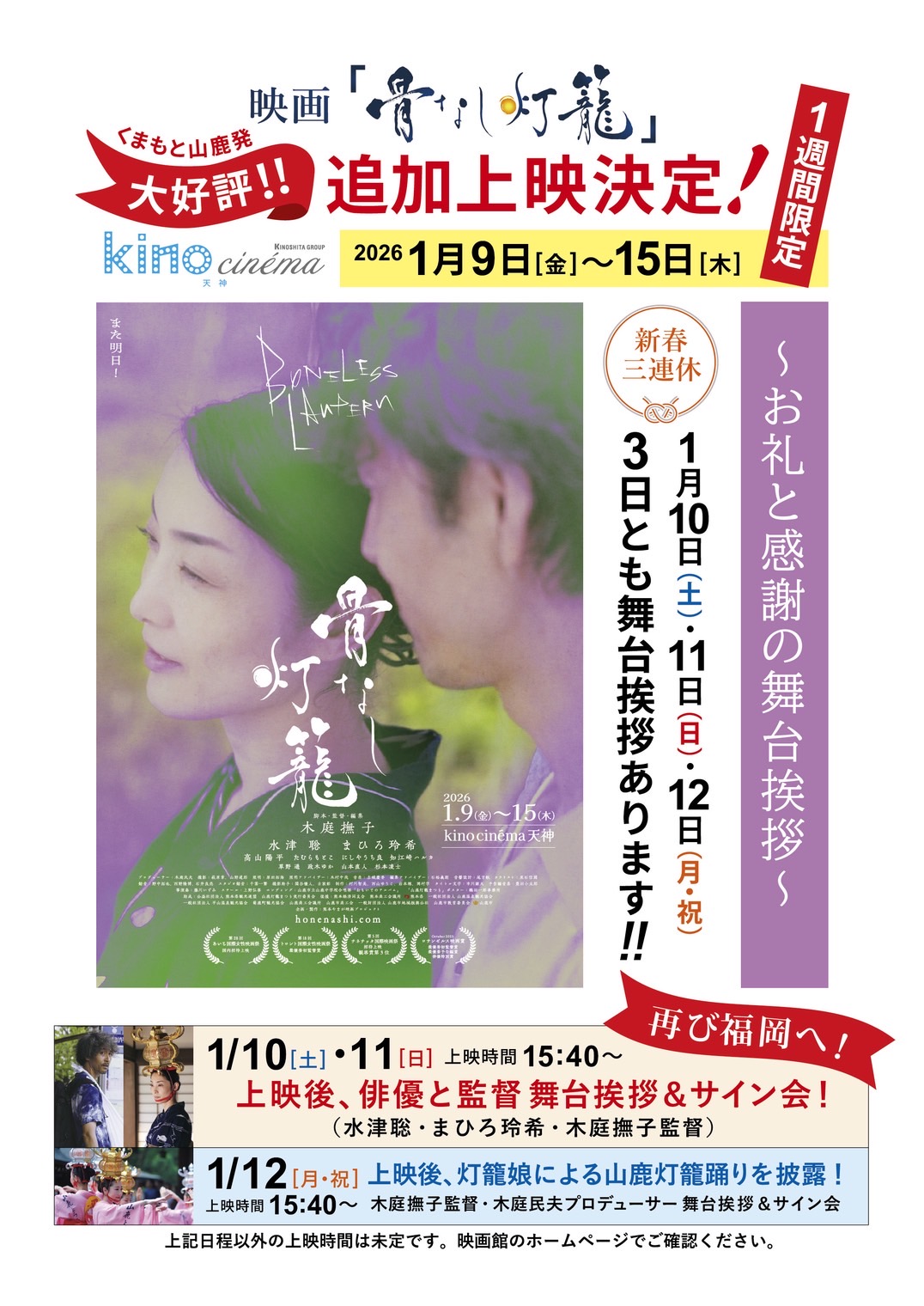 お礼と感謝の舞台挨拶三連休。キノシネマ天神でお待ちしています。